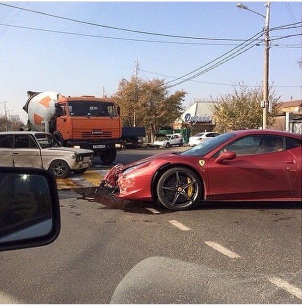 В Краснодаре произошла экзотическая авария, в которой поучаствовали два детища итальянского автопрома: Ferrari 458 Italia и ВАЗ-2106, выросший из Fiat.