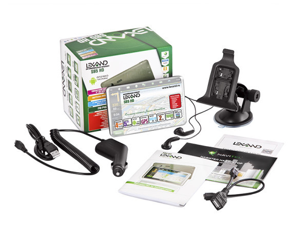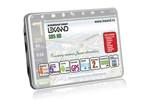 Планшет имеет 5-дюймовый дисплей (800х480 точек), 4-ядерный процессор MediaTek MTK8127 (1,3 ГГц), видеопроцессор Mali-450 MP, 512 МБ «оперативки», 4 ГБ встроенной памяти и операционную систему Android 4.4.2 KitKat «на борту». Выбор именно этой ОС не случаен – для Android доступно огромное количество бесплатных приложений, в том числе и навигационных. Предполагается, что владелец подобного гаджета будет брать его с собой везде и особенно активно пользоваться им в автомобиле. Варианты использования предполагаются разные. К примеру, LEXAND SB5 HD может заменить автомобильный навигатор, для чего в нем предустановлен 66-канальный GPS-чипсет MStar MSR2112. Даже «холодный» старт аппарата занимает менее минуты, после чего водителю сообщат его местоположение и предложат приступить к построению маршрута. Планшет в роли навигатора способен подсказывать направление движения как визуально, так и голосом – FM-трансмиттер выводит звуковое сопровождение на автомобильные колонки.